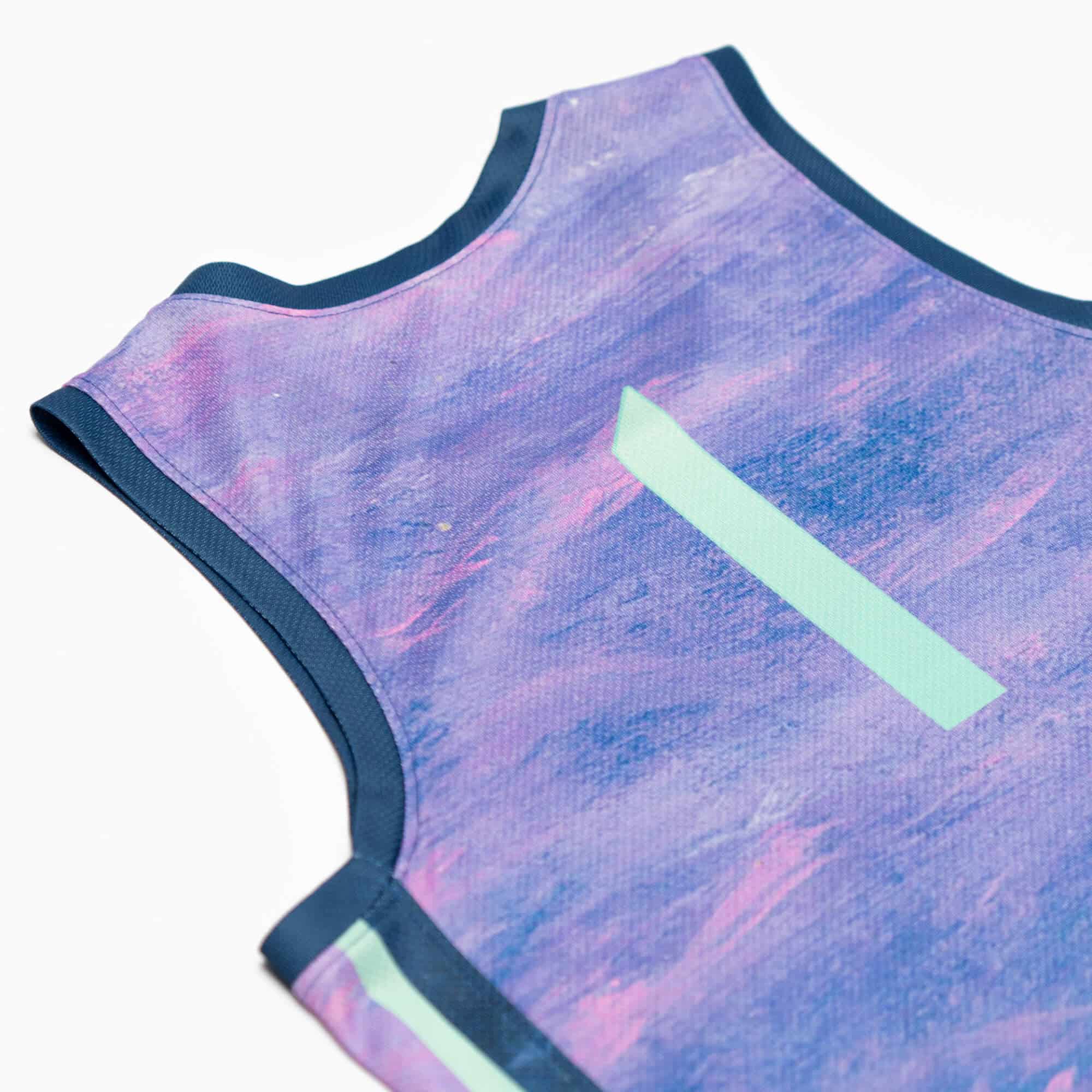 Découvrez ce maillot de basketball en édition limitée, fruit de la collaboration exceptionnelle avec l'artiste Isidore. Ce maillot unique fusionne l'art et le basketball, avec des couleurs harmonieuses de rose, violet, bleu et vert d'eau rappelant les paysages qui ont tant inspiré les peintres impressionnistes.